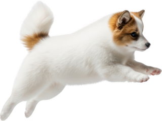 Energetic white and brown puppy mid leap showcasing a playful pose and fluffy tail isolate dog animal