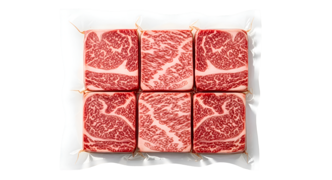 Six perfectly cut squares of marbled wagyu beef isolated on transparent background