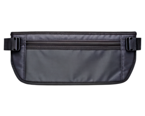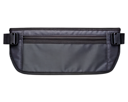 Sleek black waist bag with multiple zippered compartments on a transparent background