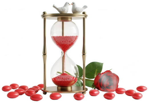 Valentine PNG, Antique gold hourglass with red sand and white doves beside red rose