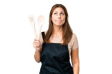 Middle age caucasian woman holding a rolling pin over isolated background and looking up