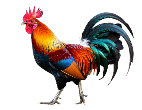 Rooster in Dynamic Walking Pose with Flowing Tail Feathers, Isolated on Black Background PNG