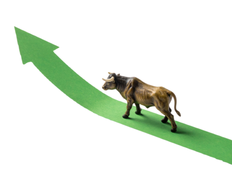 Isolated man walking on rising blue arrows above cityscape, collage style on white background, concept of business growth and individual career success