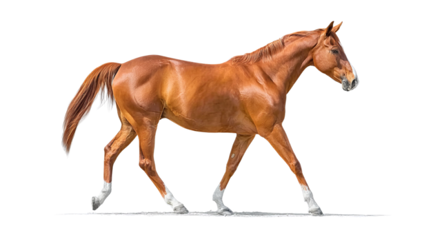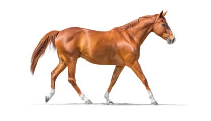 beautiful brown horse walking on a white background, side view, full body, realistic photograph, high detail, stock photography, with white empty space around the horse, high resolution, hyper-detaile