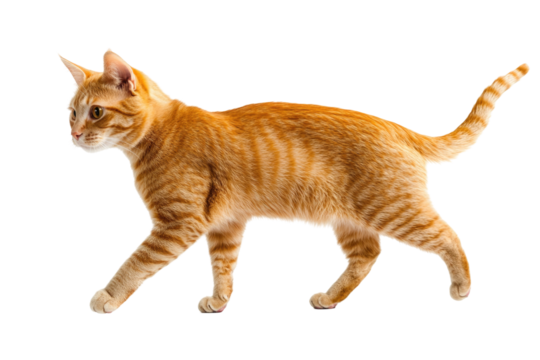Playful orange tabby cat walking gracefully in a bright setting, showcasing its vibrant fur and curious expression. on transparent background
