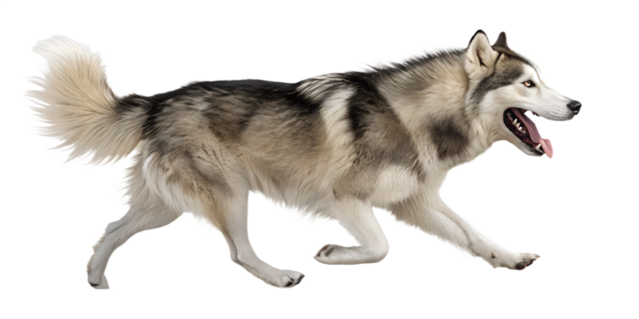 Siberian husky walking forward in motion. Dynamic realistic dog pose isolated on transparent background, PNG.