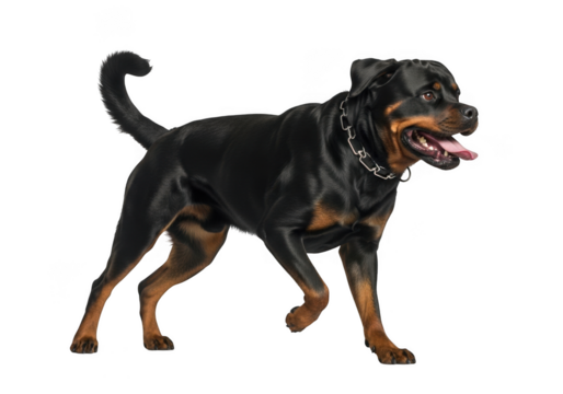 A black and tan rottweiler dog with a chain collar walking towards the right side of the frame with its mouth open and tongue out, isolated on transparent background