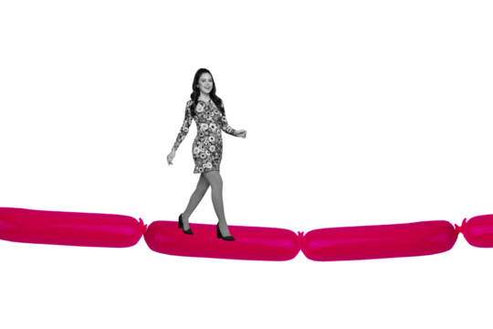 Creative drawing collage picture of young beautiful female walking sausage bridge cooking supermarket advert magazine surrealism metaphor