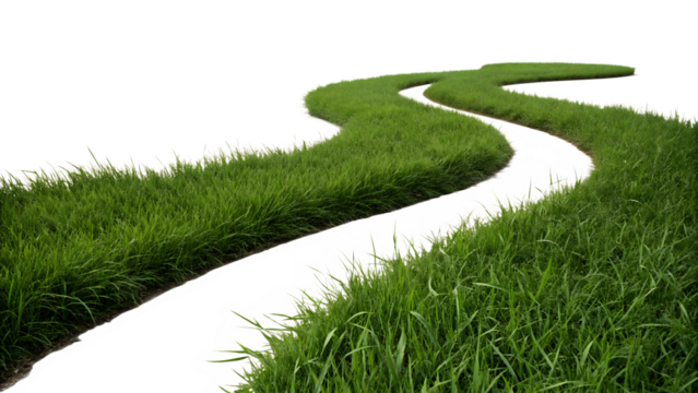 S-shaped dirt trail winding through bright green rolling countryside with smooth curved landscape contours, isolated on a transparent background