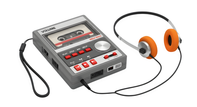 Vintage portable cassette tape recorder player with orange headphones isolated on transparent background