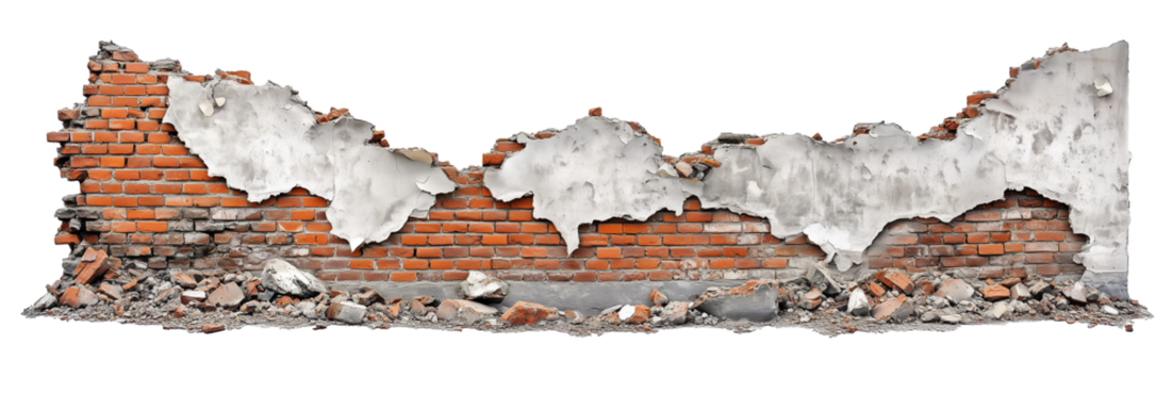 Damaged Red Brick Wall with Eroded Cement and Gritty Surface on transparent background