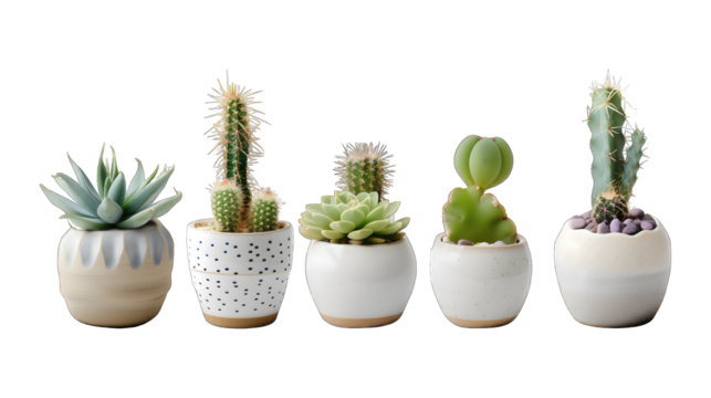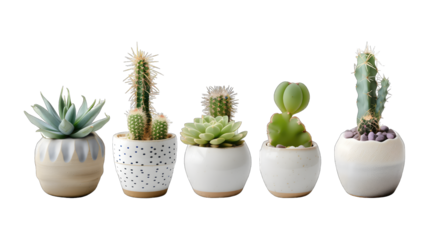 Collection of various cactus and succulent plants in different pots. Potted cactus house plants on white shelf against white wall.