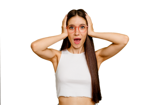 Young caucasian brunette long hair woman cutout isolated covering ears with hands trying not to hear too loud sound.