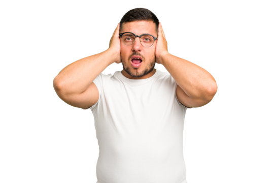 Young caucasian man isolated covering ears with hands trying not to hear too loud sound.