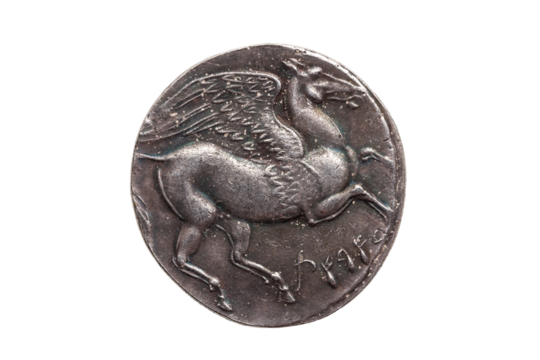 Silver 5 shekel Carthaginian coin replica with portrait of Tanit the sky goddess and the winged horse Pegasus on the reverse from the First Punic War 264-260 BC, cut out and isolated on a transparent