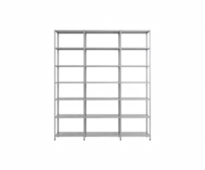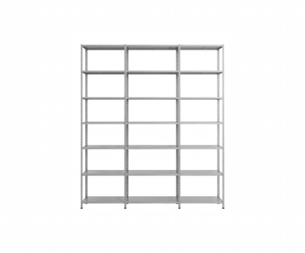 Industrial shelving unit, multi-tiered with light-wood shelves, viewed straight on