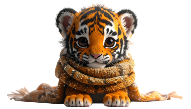 Adorable tiger cub with big brown eyes, wrapped in a cozy, snow-dusted orange scarf