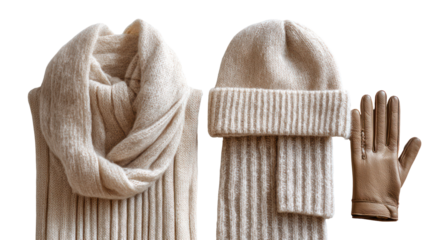 Ribbed knit dresses with matching wool scarf and leather gloves on transparent background