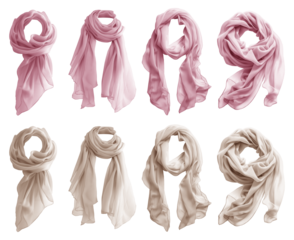 2 Set of pastel light pink beige cream chiffon silk silky flowy soft scarf shawl wrap, front and flat lay view on transparent cutout PNG file. Many different angle. Mockup template for artwork design