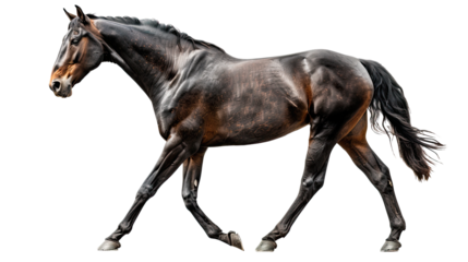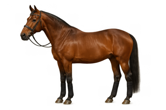 Bay horse, wearing bridle and leg wraps, standing in a classic side profile, isolated on a transparent background