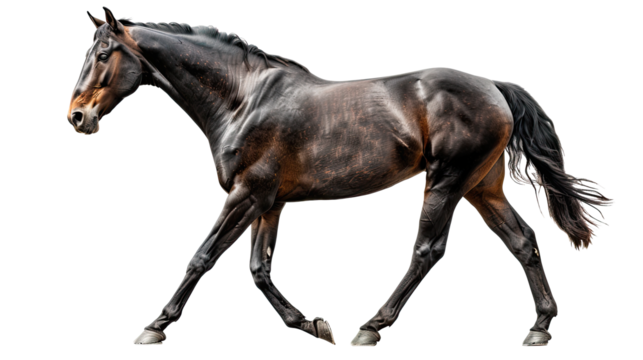 A magnificent seal brown warmblood horse mid-trot, detailed muscular definition enhanced by high-key studio rim lighting, pure equine majesty concept