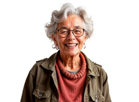 A joyful elderly woman smiling warmly on a transparent PNG background