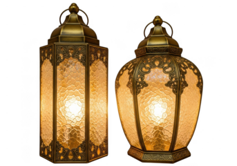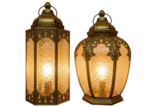 Ornate brass lanterns glowing warmly illuminated by inner light. Two vintage lanterns with intricate designs, casting a warm glow, isolated on transparent background