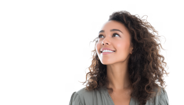 A young woman with curly hair gazes upward with a joyful expression. set against a bright white background. conveying a sense of hope and positivity. ideal for motivational themes