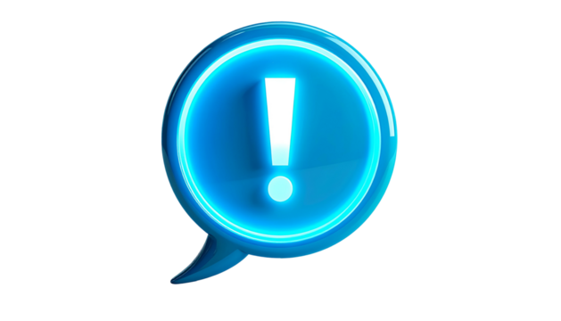 A vibrant, neon blue speech bubble, radiating a soft glow against a stark black background, highlighting a white exclamation mark