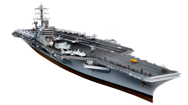 Aircraft Carrier: An impressive aircraft carrier cuts through the open sea, showcasing the might and technology. Its sleek design and massive size represent power and mobility.