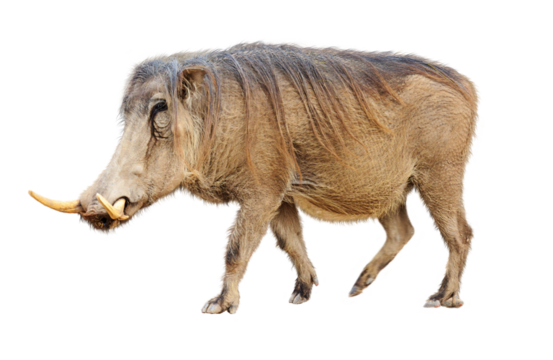 Isolated Wart hog standing in profile view showcasing formidable tusks and bristly coat