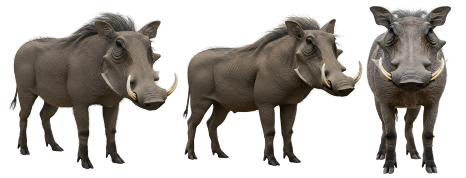 Three warthogs posing with tusks on a plain isolated presentation transparent background