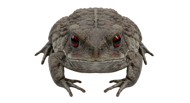 Frontal view of a warty toad with striking red eyes and textured skin