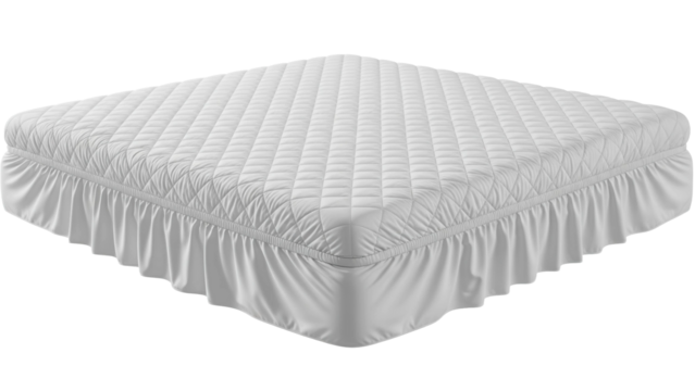 White quilted mattress protector with bed skirt, cut out, stock png, isolated on transparent background