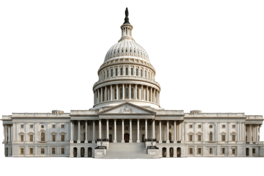 Front View of United States Capitol Building with Detailed Dome, PNG Architecture Landmark Isolated on Transparent Background