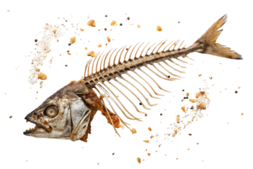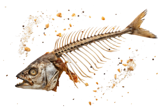 Cooked fish skeleton with crumbs and spices on transparent background – partially eaten seafood remains, realistic food waste concept