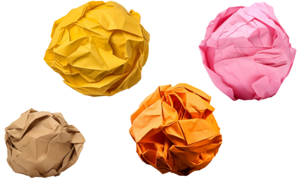 Front View To a Set of colored crumpled paper balls PNG isolated on white and transparent background - Wrinkled Colorful paper Page texture Paper discard