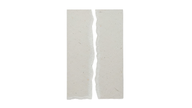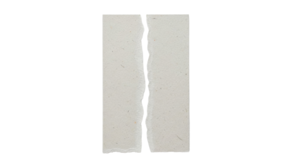 Rectangular recycled paper piece, vertical tear down the middle Plain white background