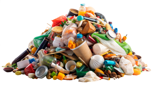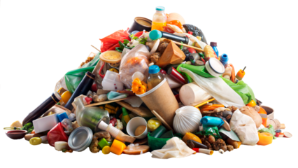 A mountain of garbage with a transparent background. Colorful mixed waste pile with plastics, food, and containers, highlighting recycling and pollution issues.