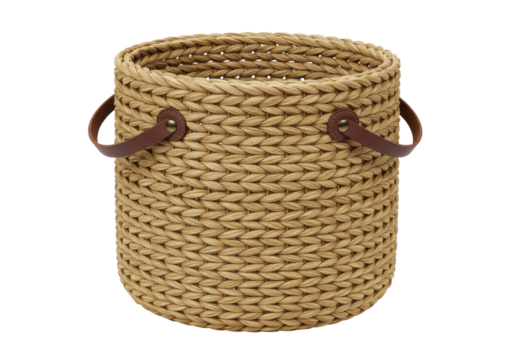 Isolated woven wicker wastepaper basket with leather handles, natural materials decor item