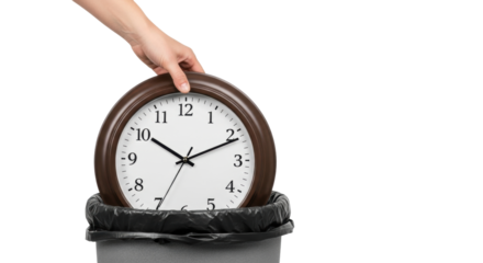 Isolated image of throwing an outdated clock into a trash can, representing concept