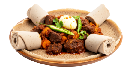 Ethiopian injera with doro wat and vegetable stew isolated on transparent background