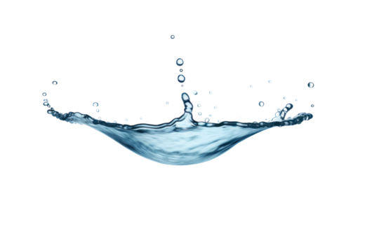 A single drop of water falling into a clear pool, causing a splash with droplets dispersing outward, isolated on white background
