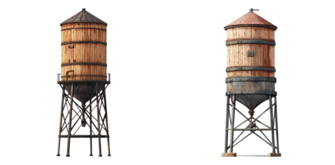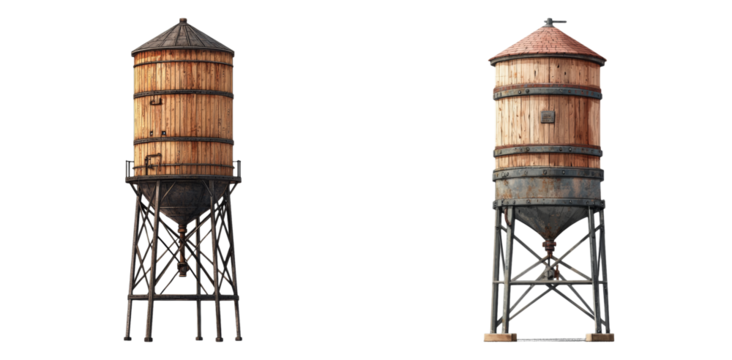 Rustic rooftop water tanks isolated on transparent PNG image ideal for urban landscape design or industrial environment illustrations