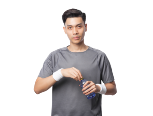 A man drinks water from a bottle on a transparent background.