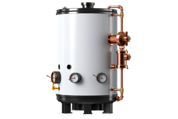 A Sleek Water Heater With Copper Plumbing and Gauges on a Clear PNG or White Background.