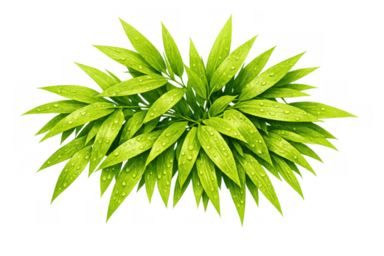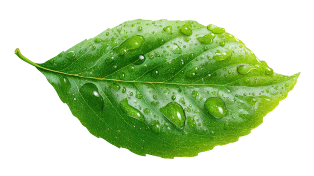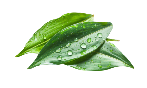 Green leaves with water droplets, fresh plant foliage showing natural growth and vitality on transparent background
