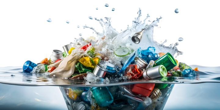 Overflowing bin of plastic waste in water png isolated on transparent background