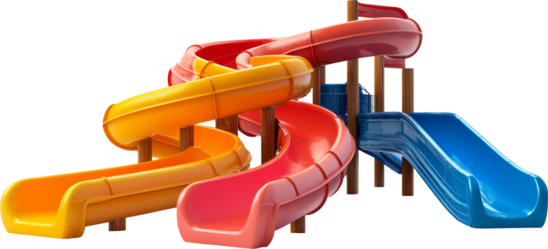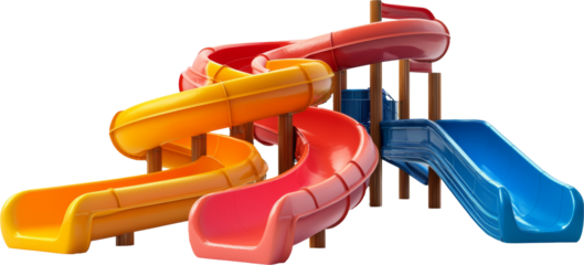 A colorful water slide with yellow and purple tubes, isolated on transparent background