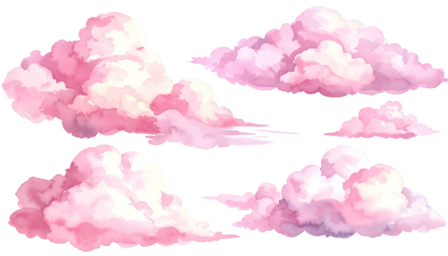 Collection of fluffy, watercolor-style pink clouds on a transparent background